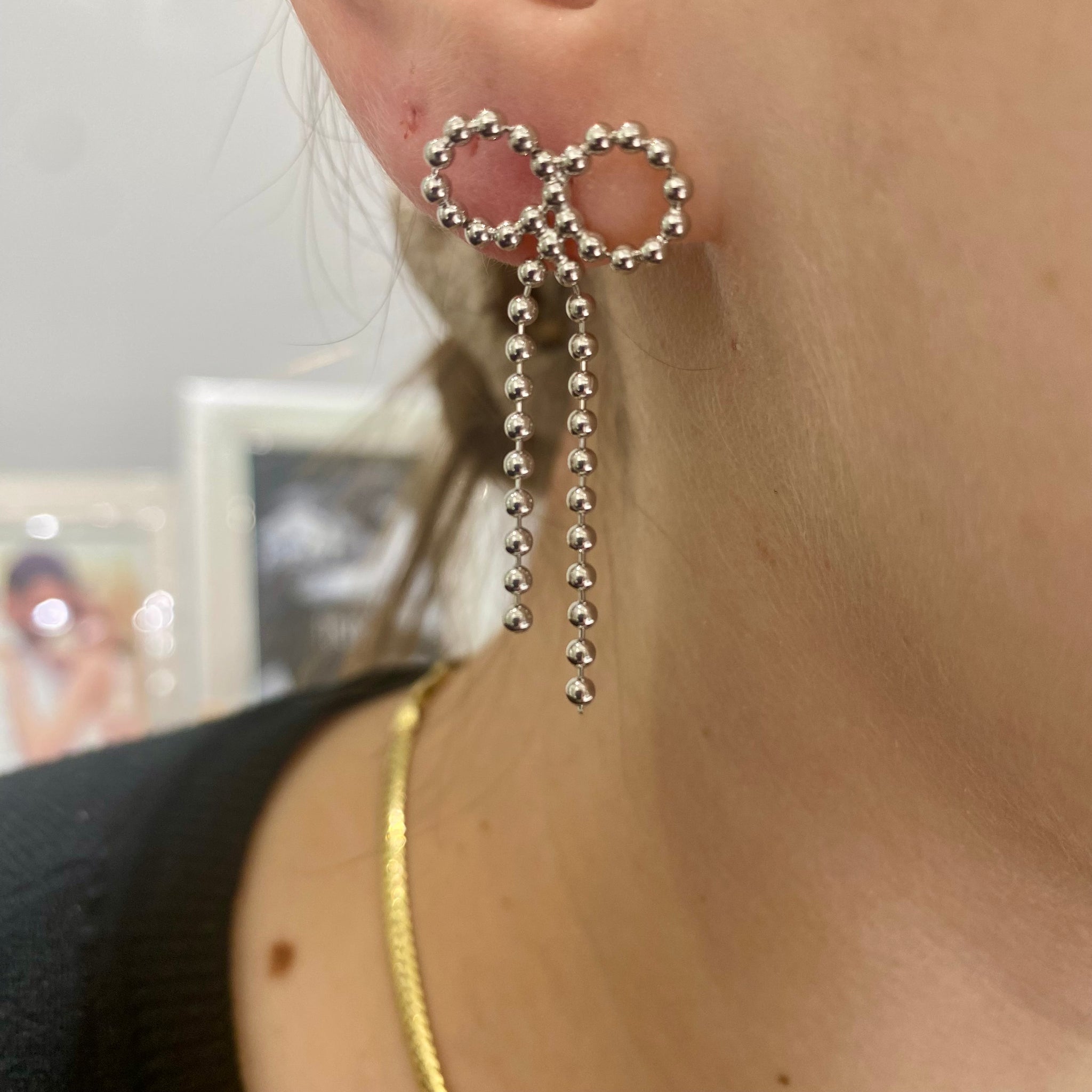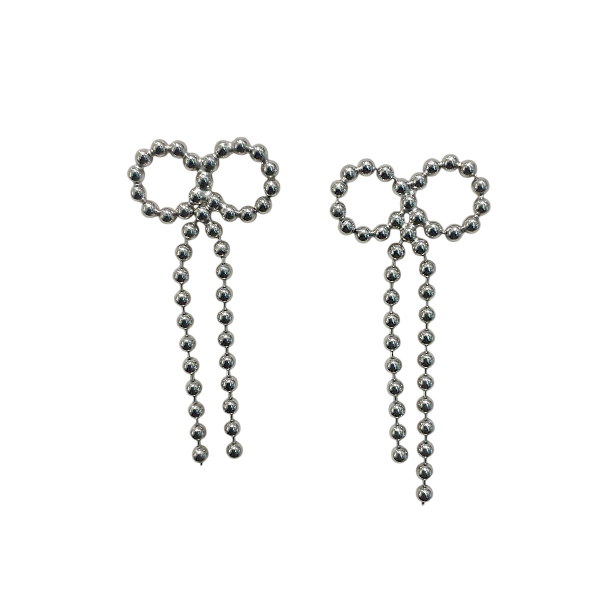 Orecchini in argento 925% pendenti, con fiocco e palline con chiusura paletto e farfallina.