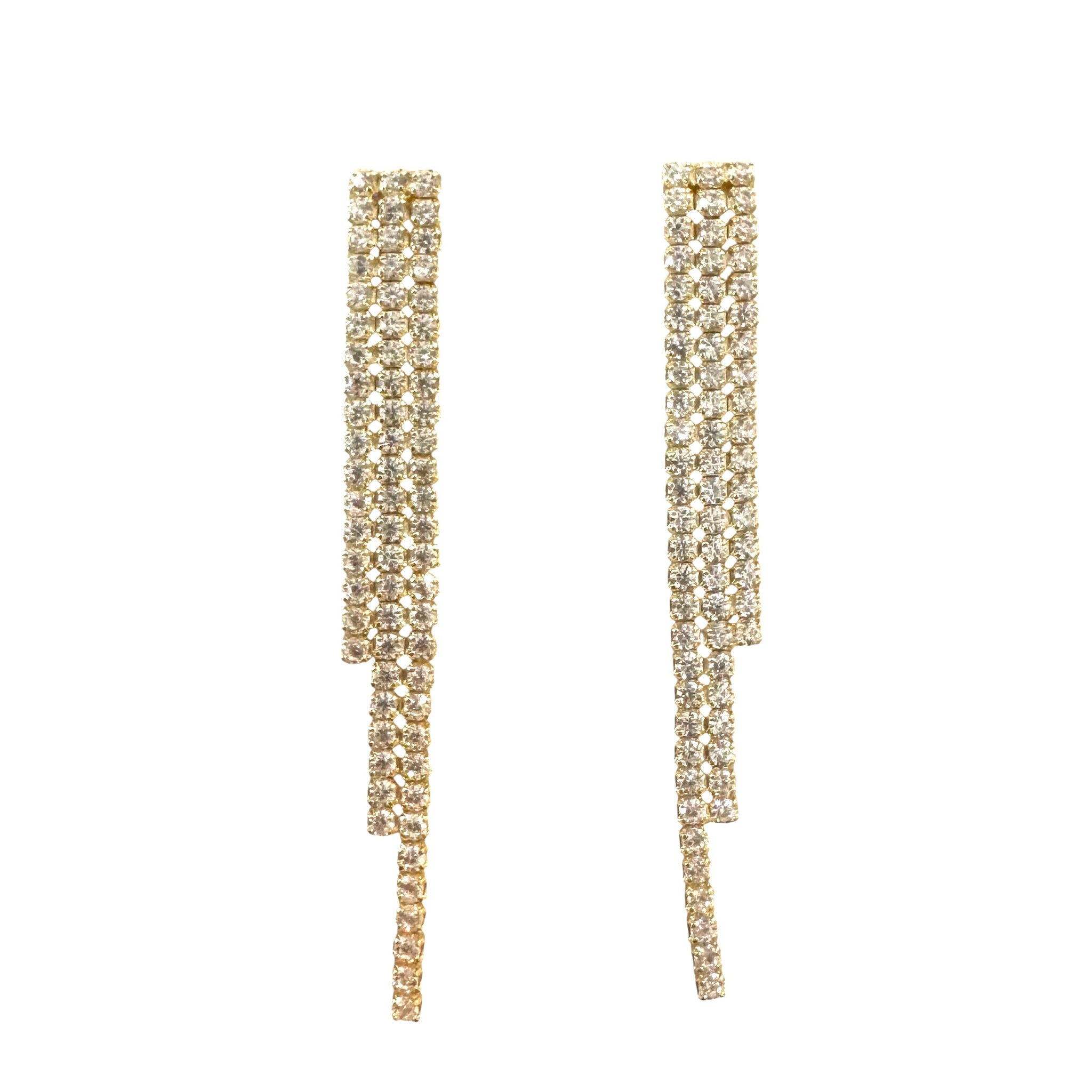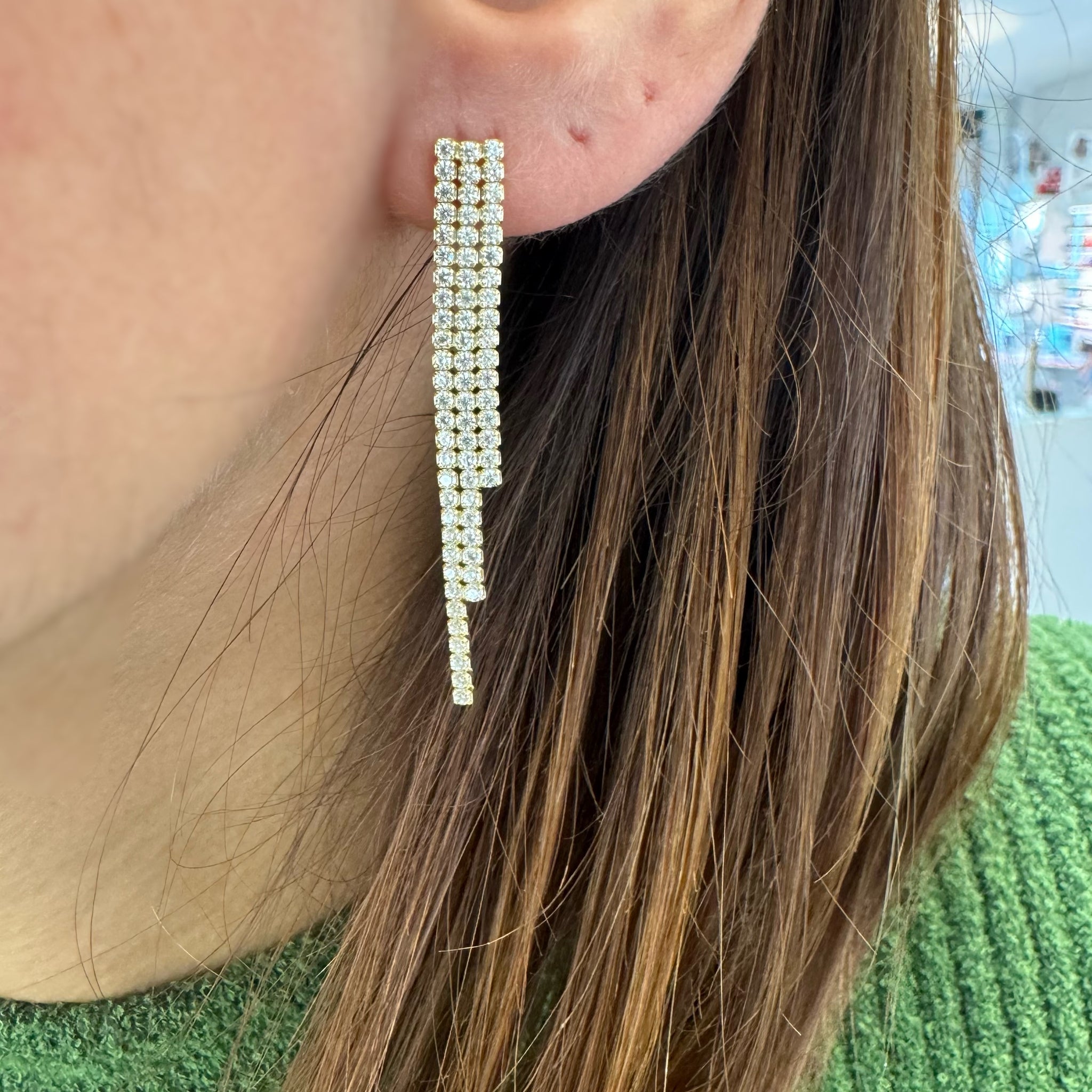 Orecchini in argento 925% placcato oro giallo con zirconi incastonati sui 3 fili pendenti di lunghezza differenti e con chiusura paletto e farfallina.