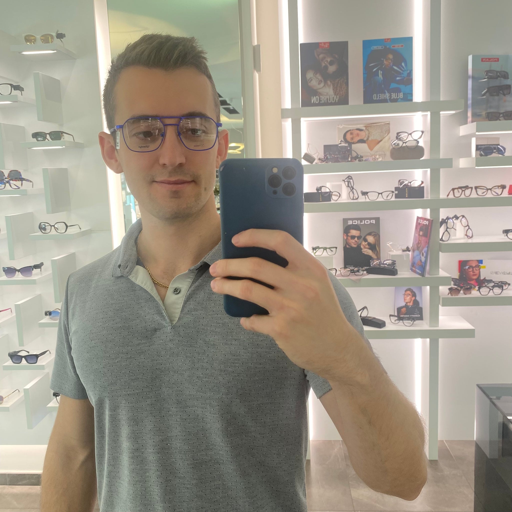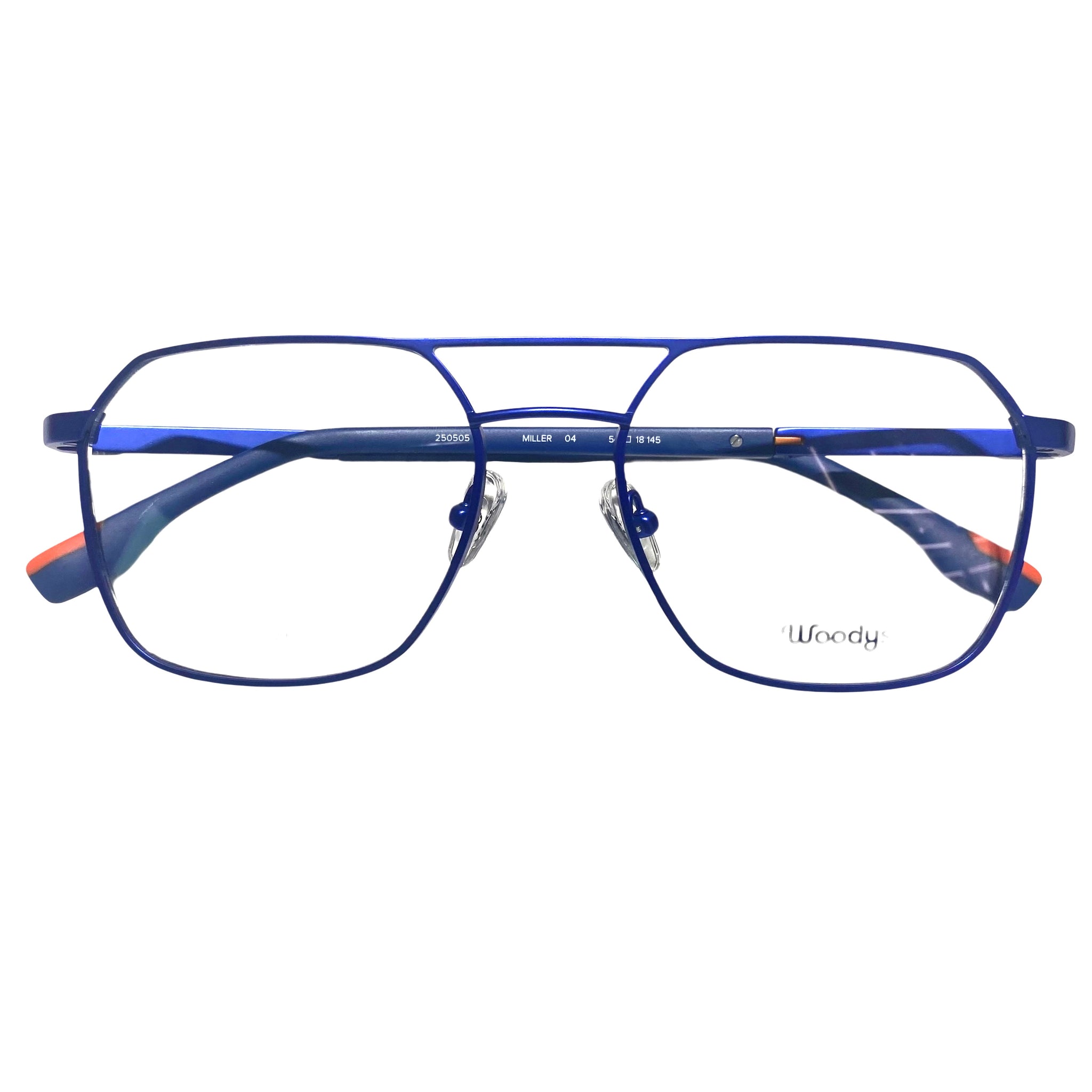 Occhiale da vista in titanio blu con doppio ponte è dettaglio laterale con finali dell’asta rosso.