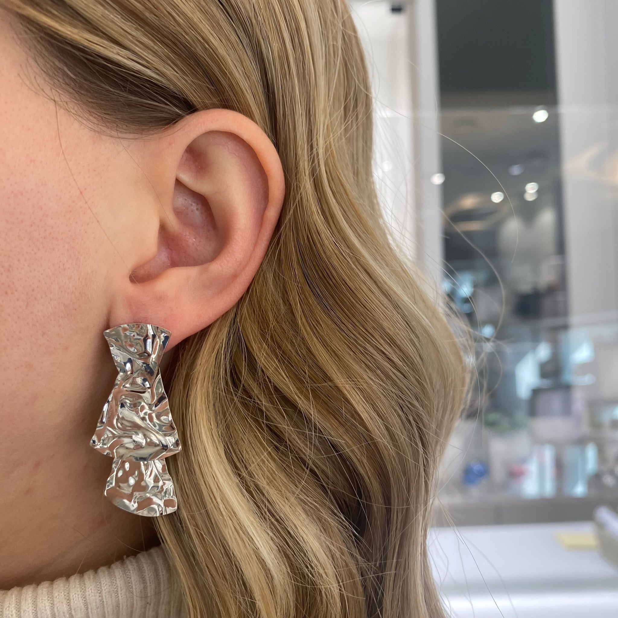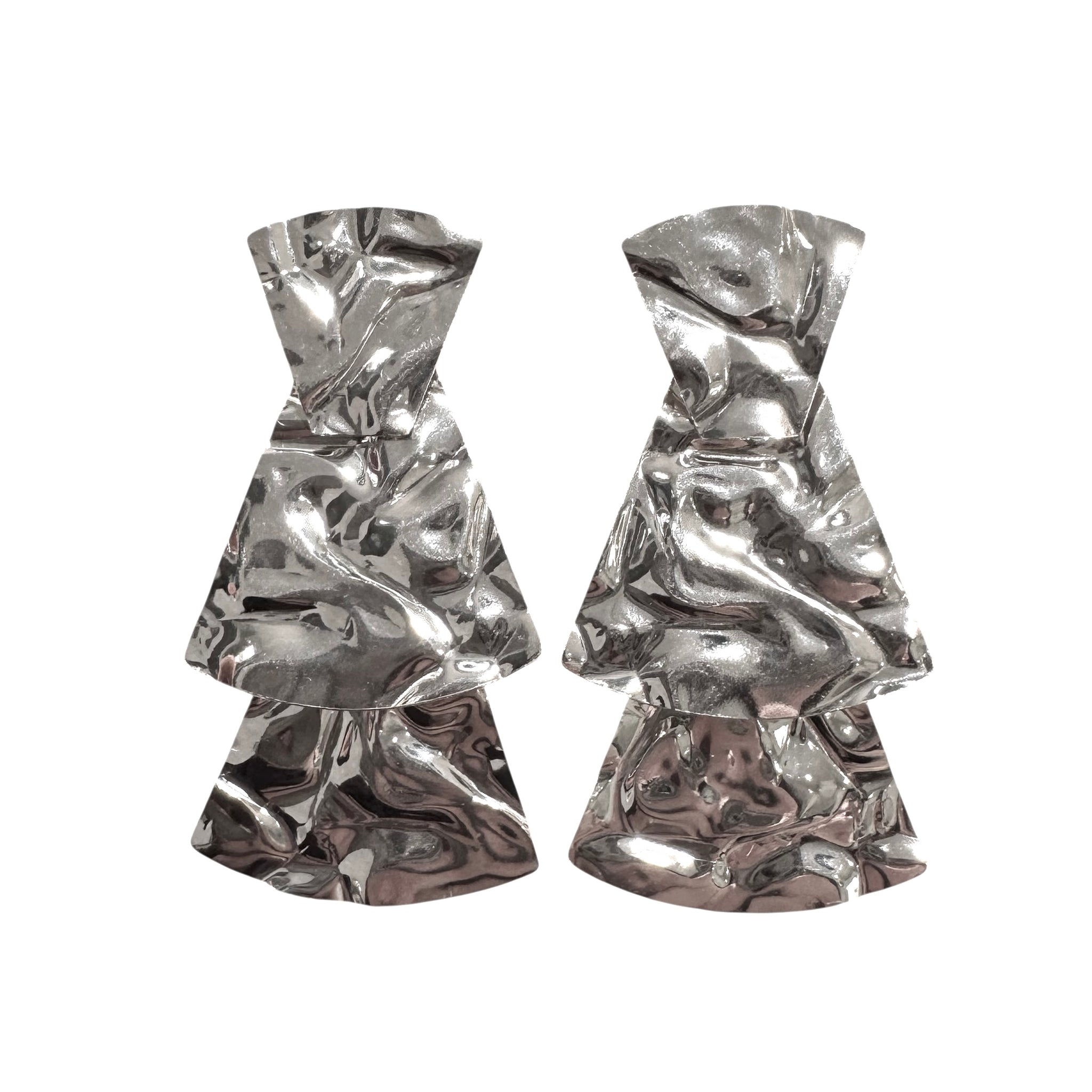 Orecchini in argento 925% con chiusura paletto e farfallina pendenti con lavorazione martellata sulle tre lastre piatte.