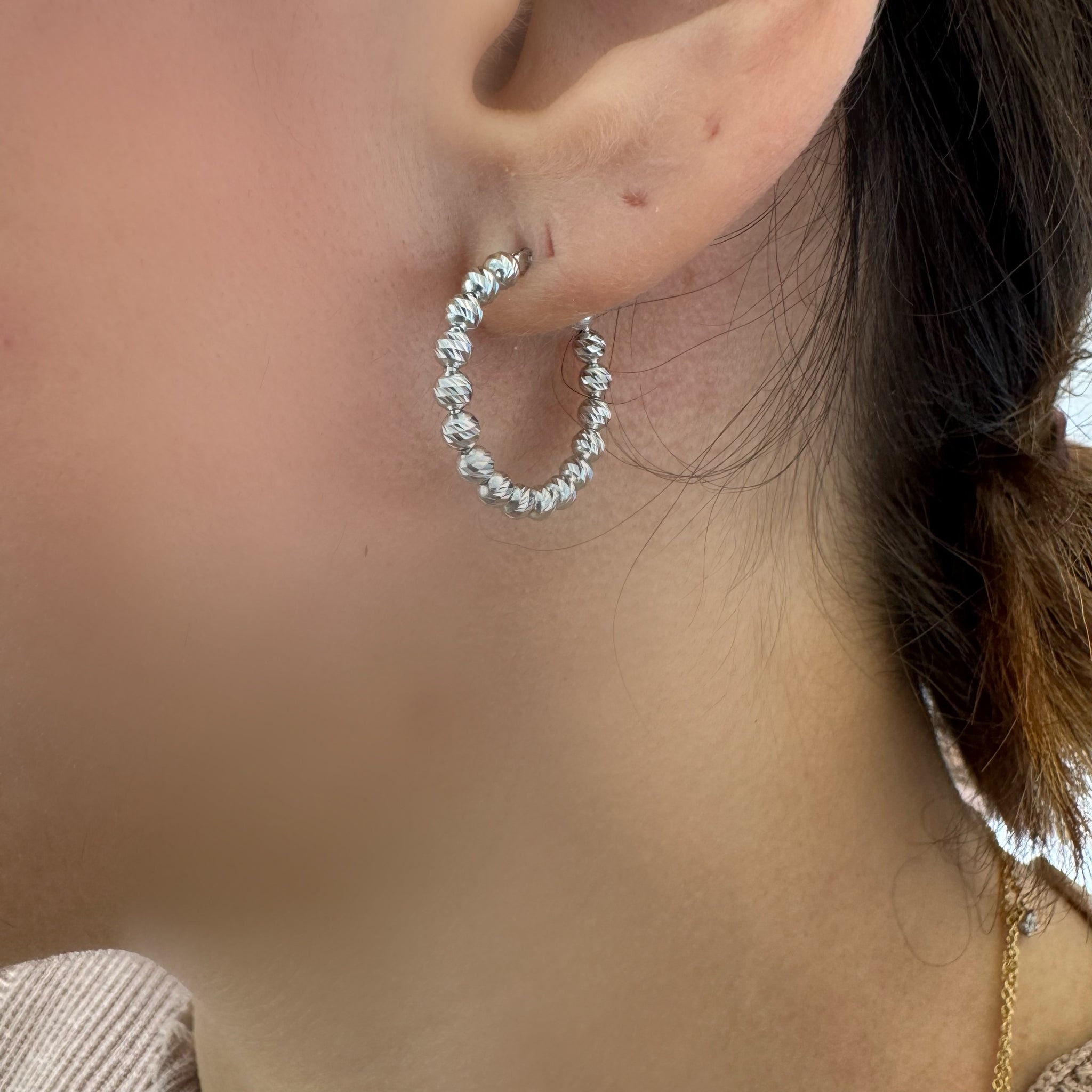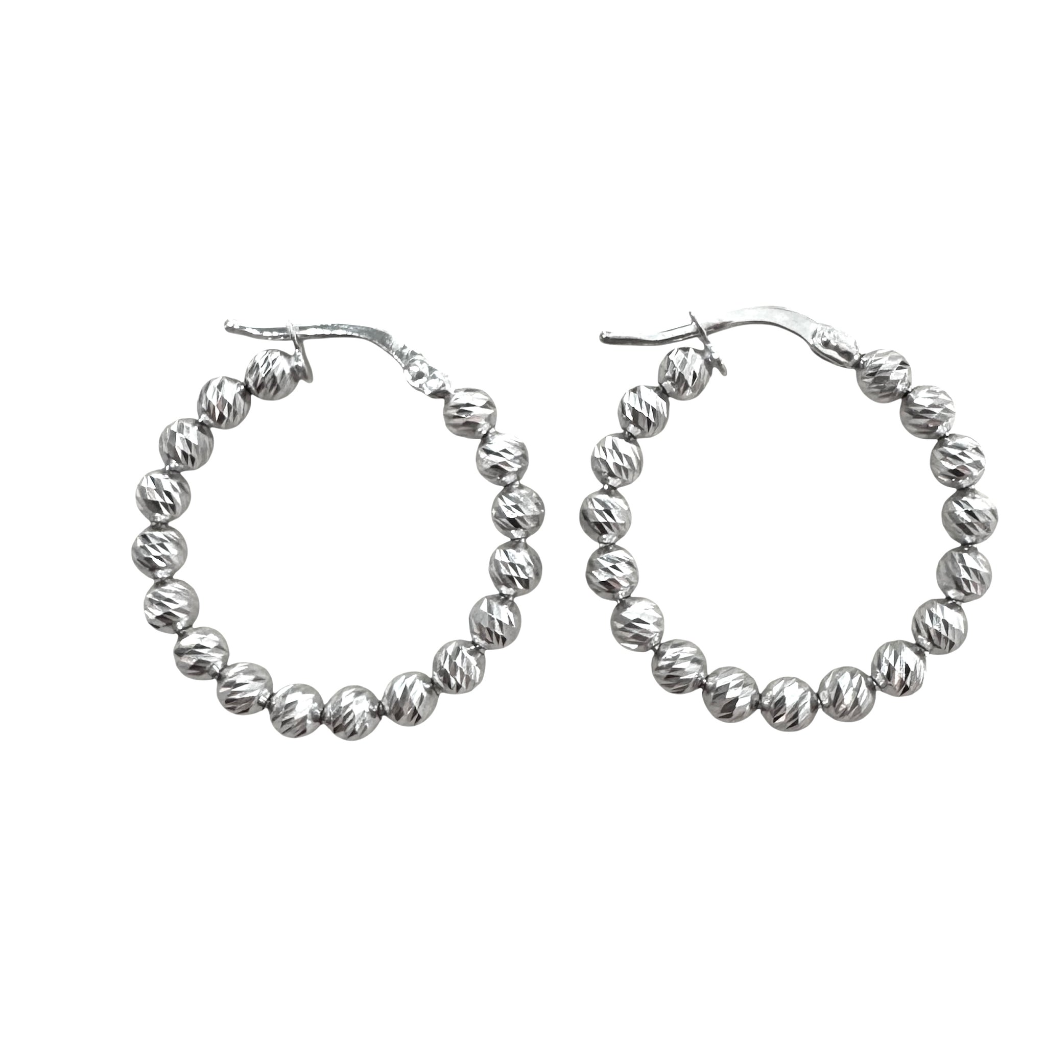 Orecchini in oro bianco 18KT/750% a forma di cerchio con palline diamantate distribuite su tutta la circonferenza con chiusura a forcella.