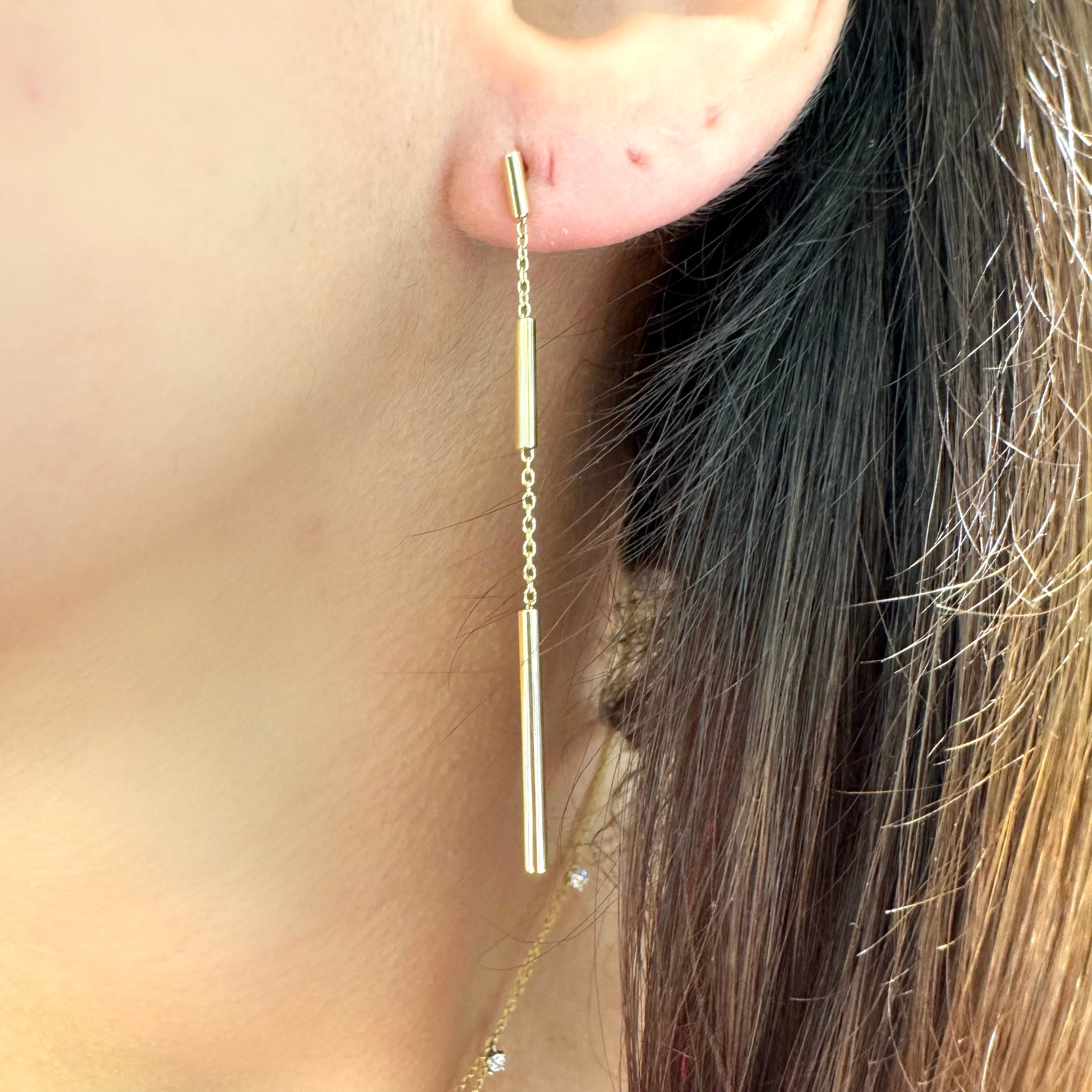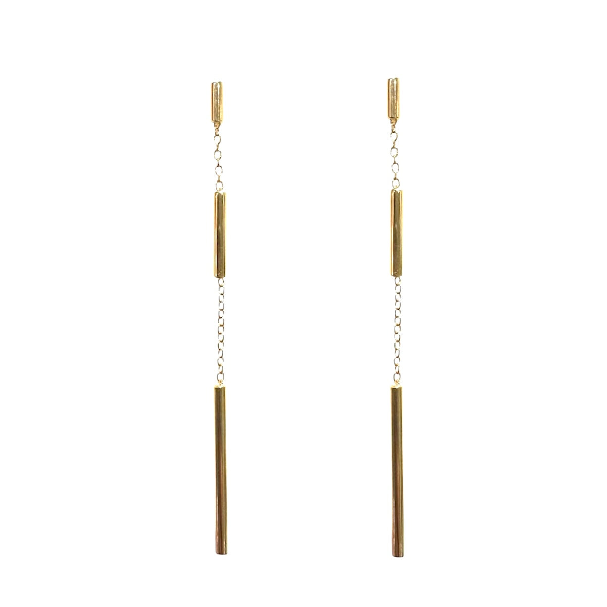 Orecchini in oro giallo 18KT/750% con catenella pendente modello roló alternata a barrette lisce con chiusura a farfallina.