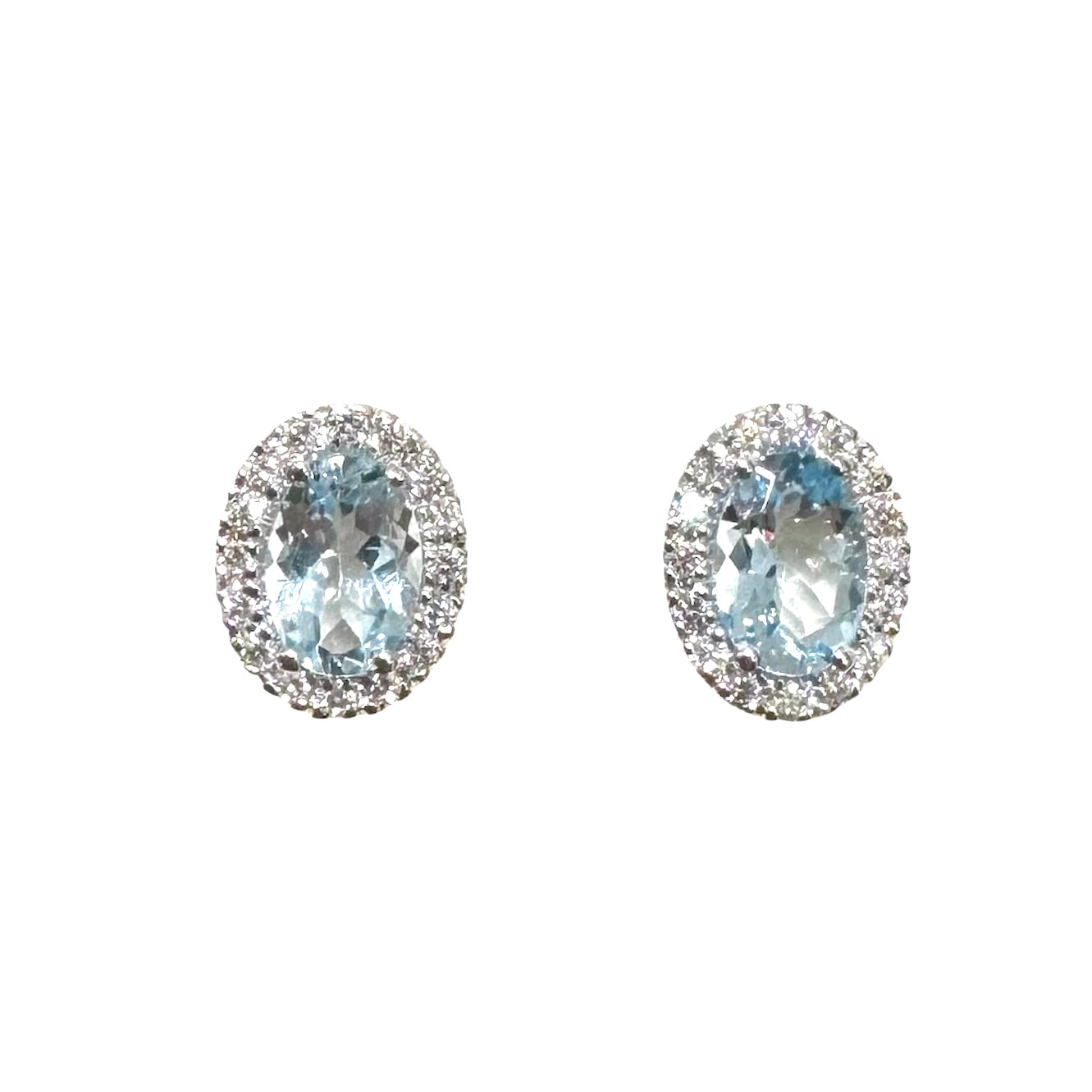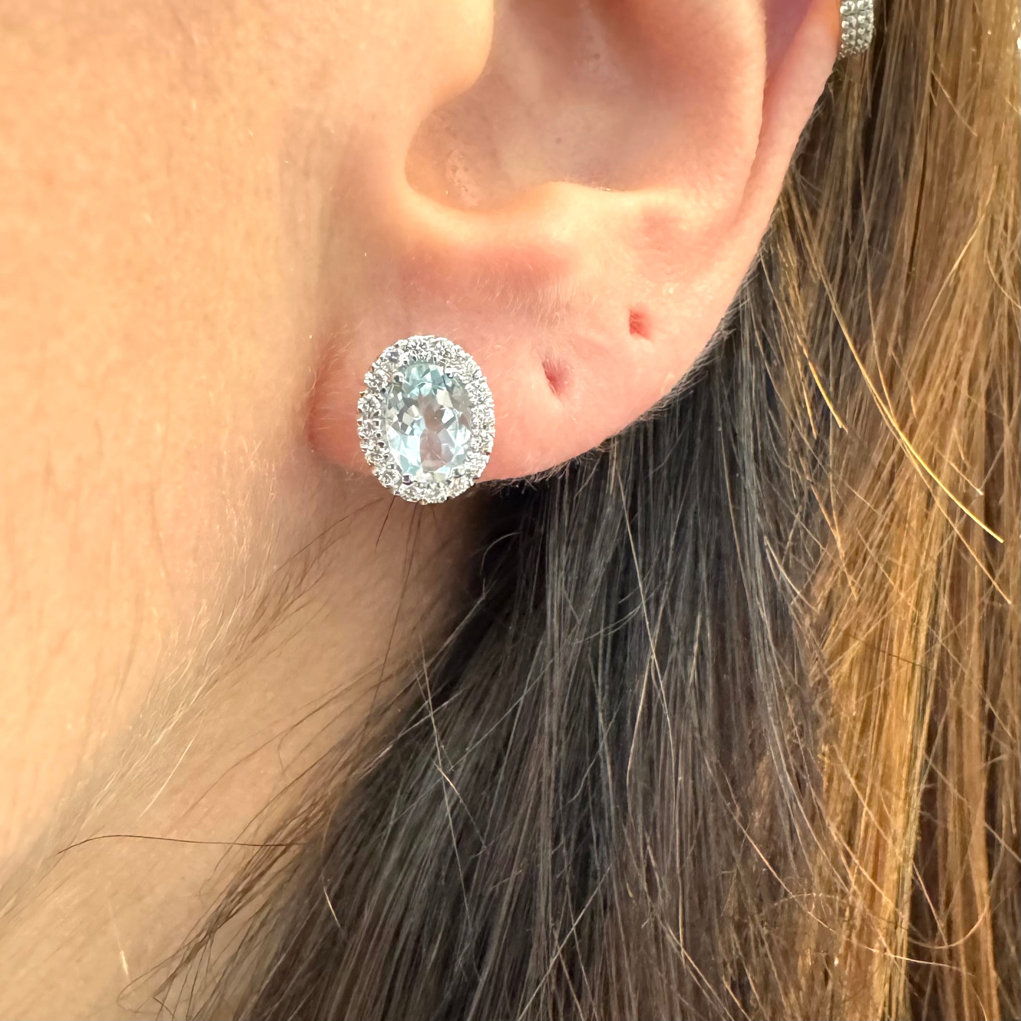 Orecchini in oro bianco 18KT/750% a lobo con Acquamarina ovale a goccia e diamanti di contorno.