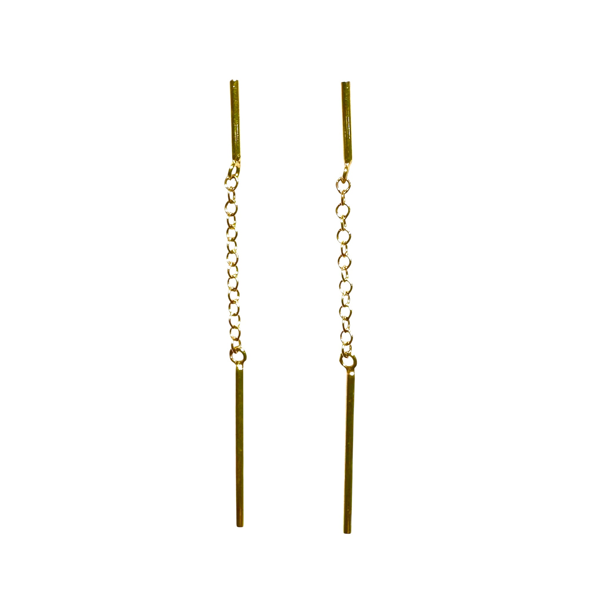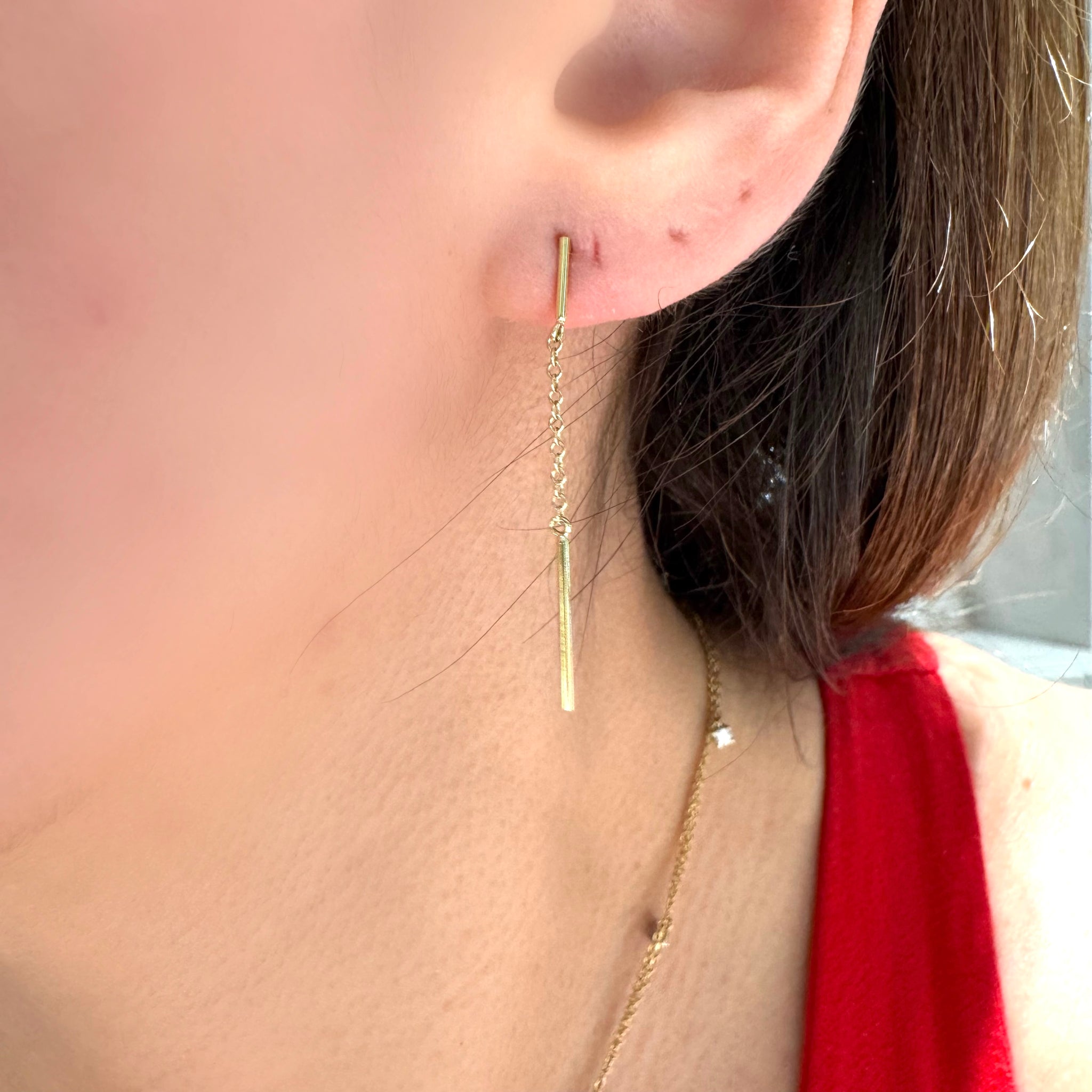 Orecchini in oro giallo 18KT/750% con dure barrette lisce alternate da catenella pendente modello roló pendente con chiusura a farfallina.