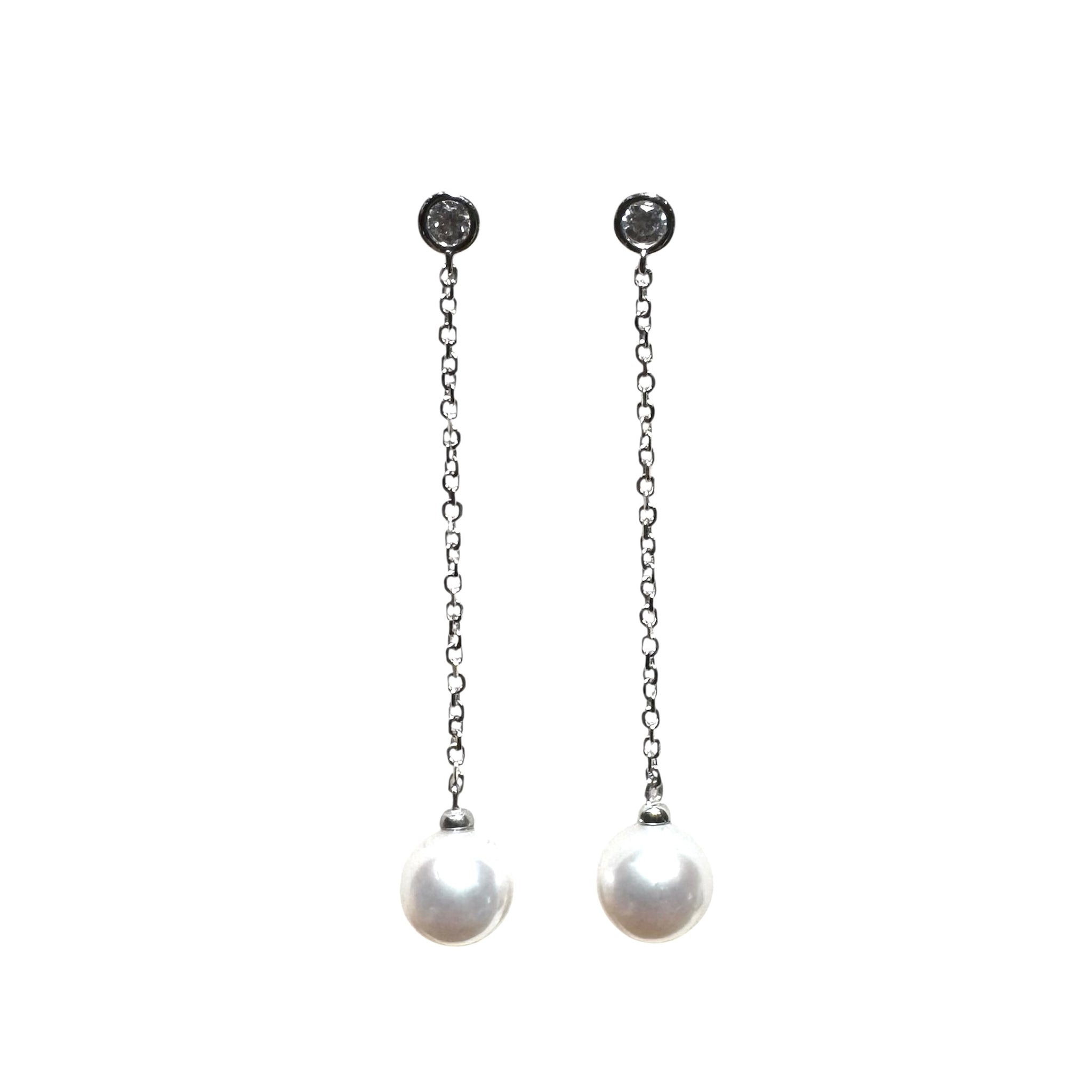 Orecchini in oro bianco 18KT/750% pendenti con zircone incastonato a lobo e perla naturale di fiume sul finale della catenella.