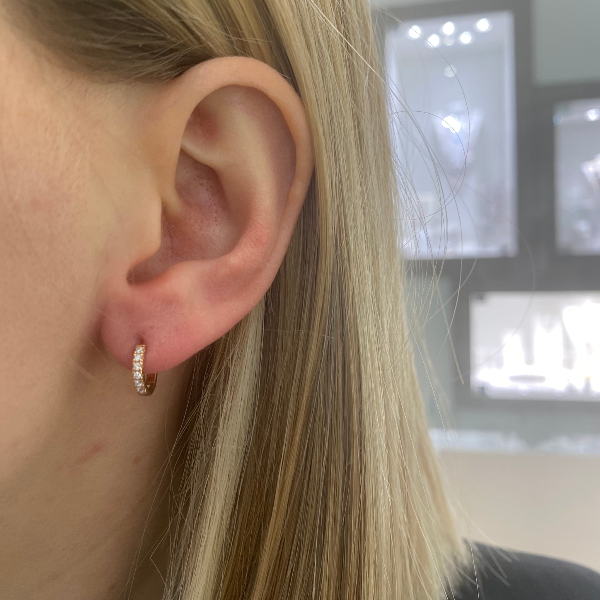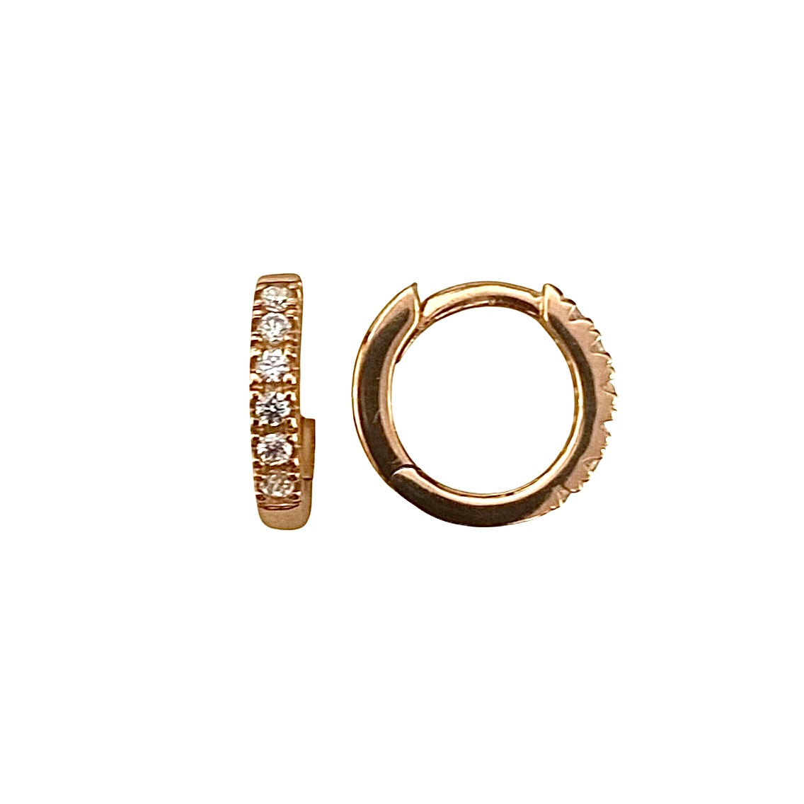Orecchini in oro rosa 18KT/750% con zirconi incastonati sulla parte frontale e chiusura a scattino.
