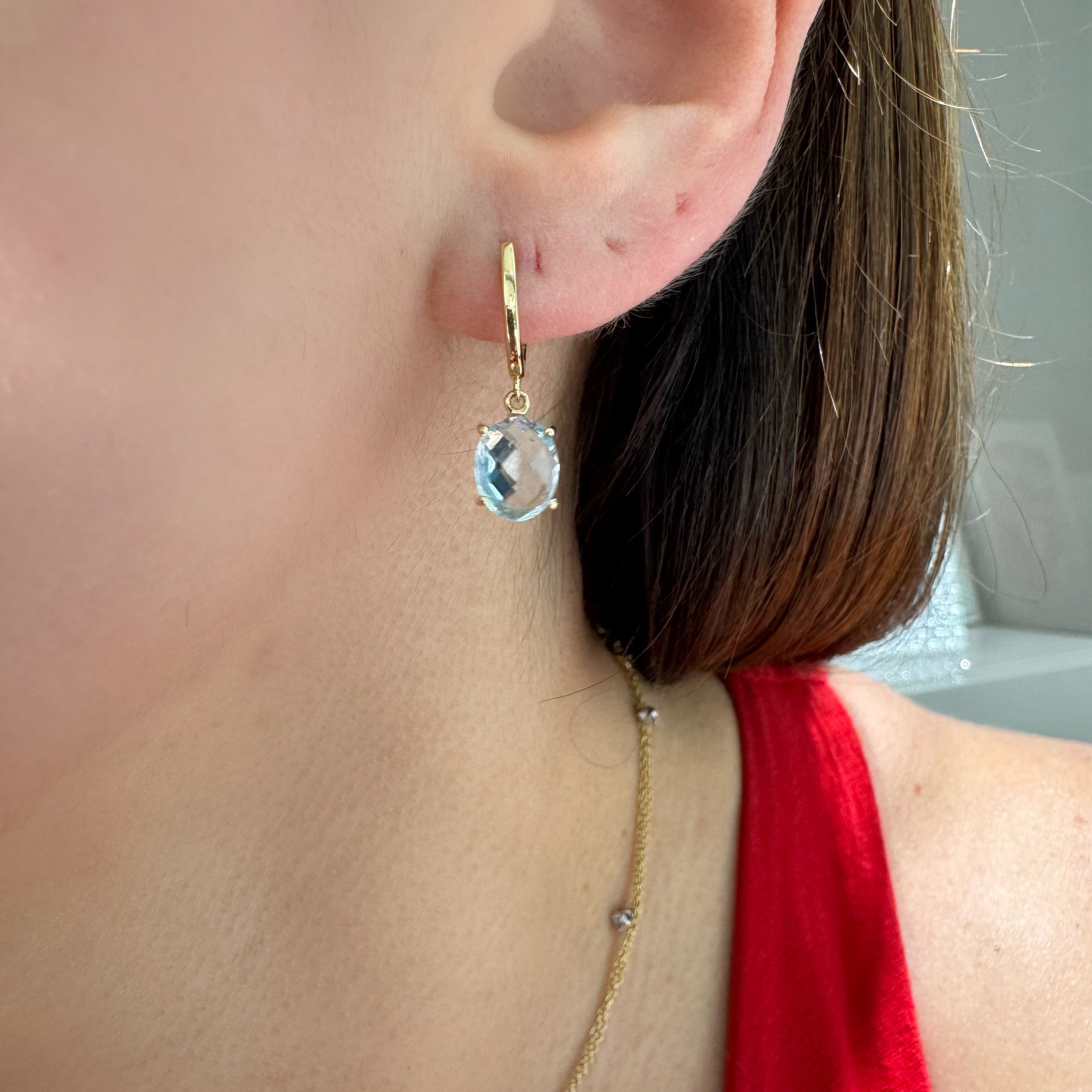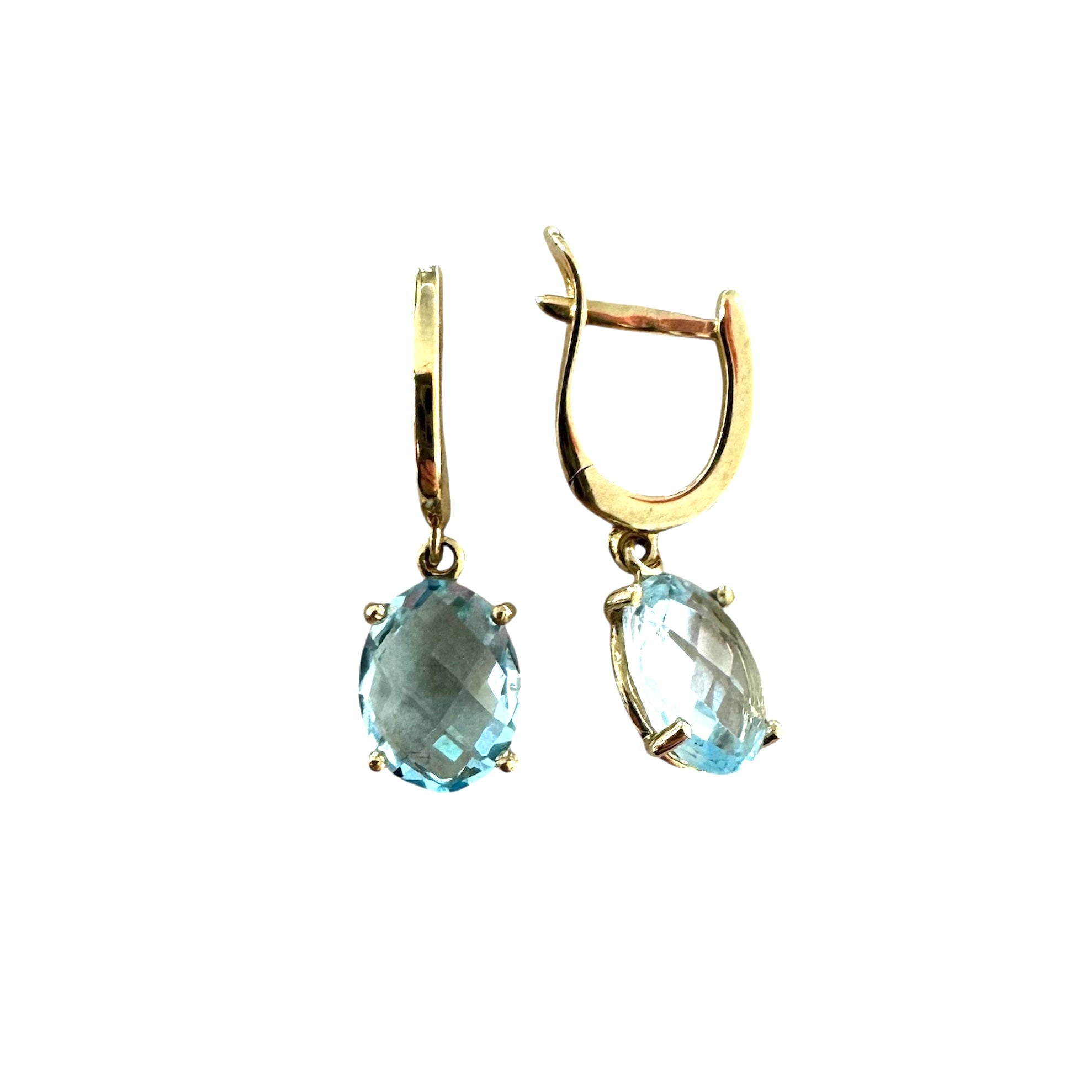 Orecchini in oro giallo 18KT/750% con topazio azzurro pendente dalla forma ovale e con taglio briolette e chiusura a scattino.