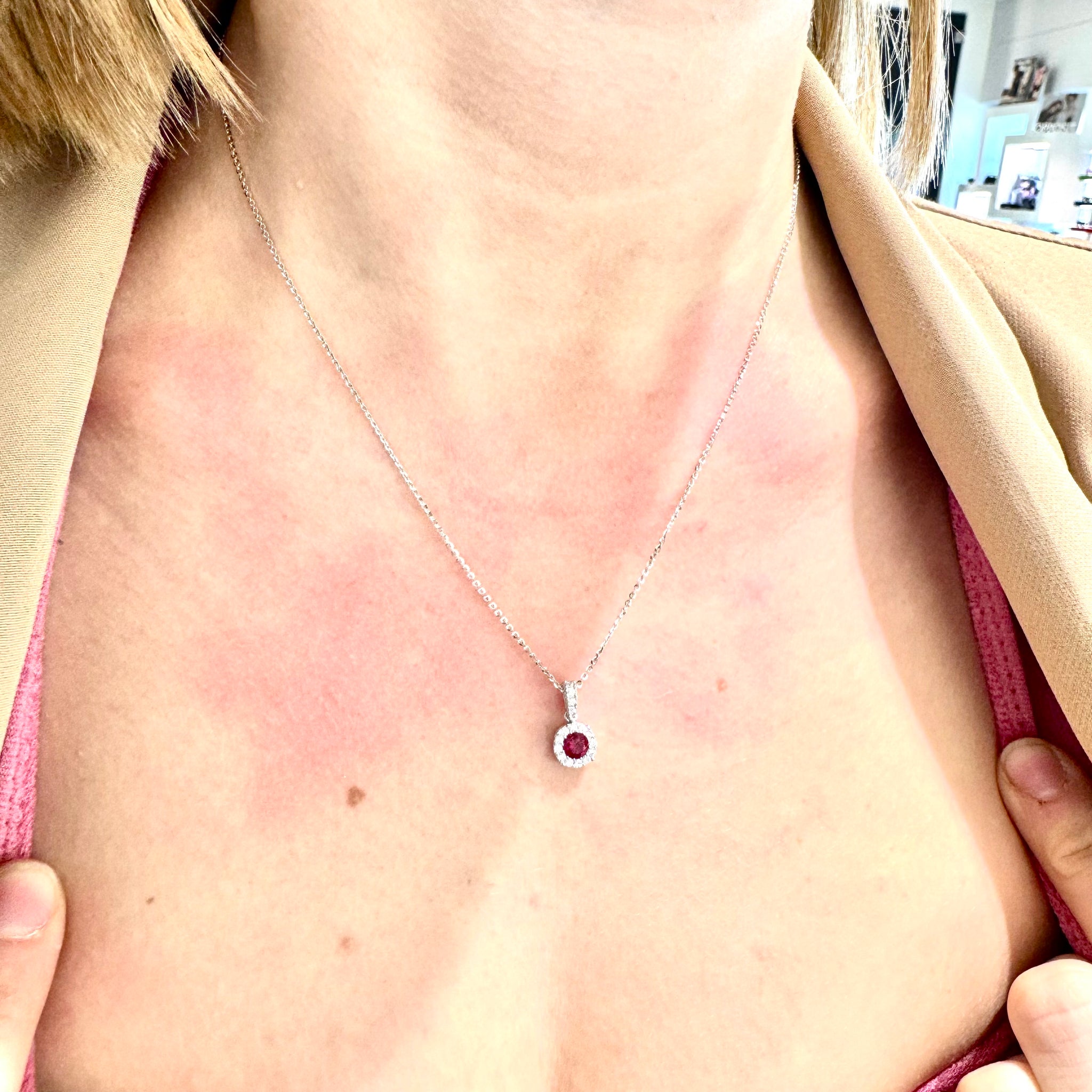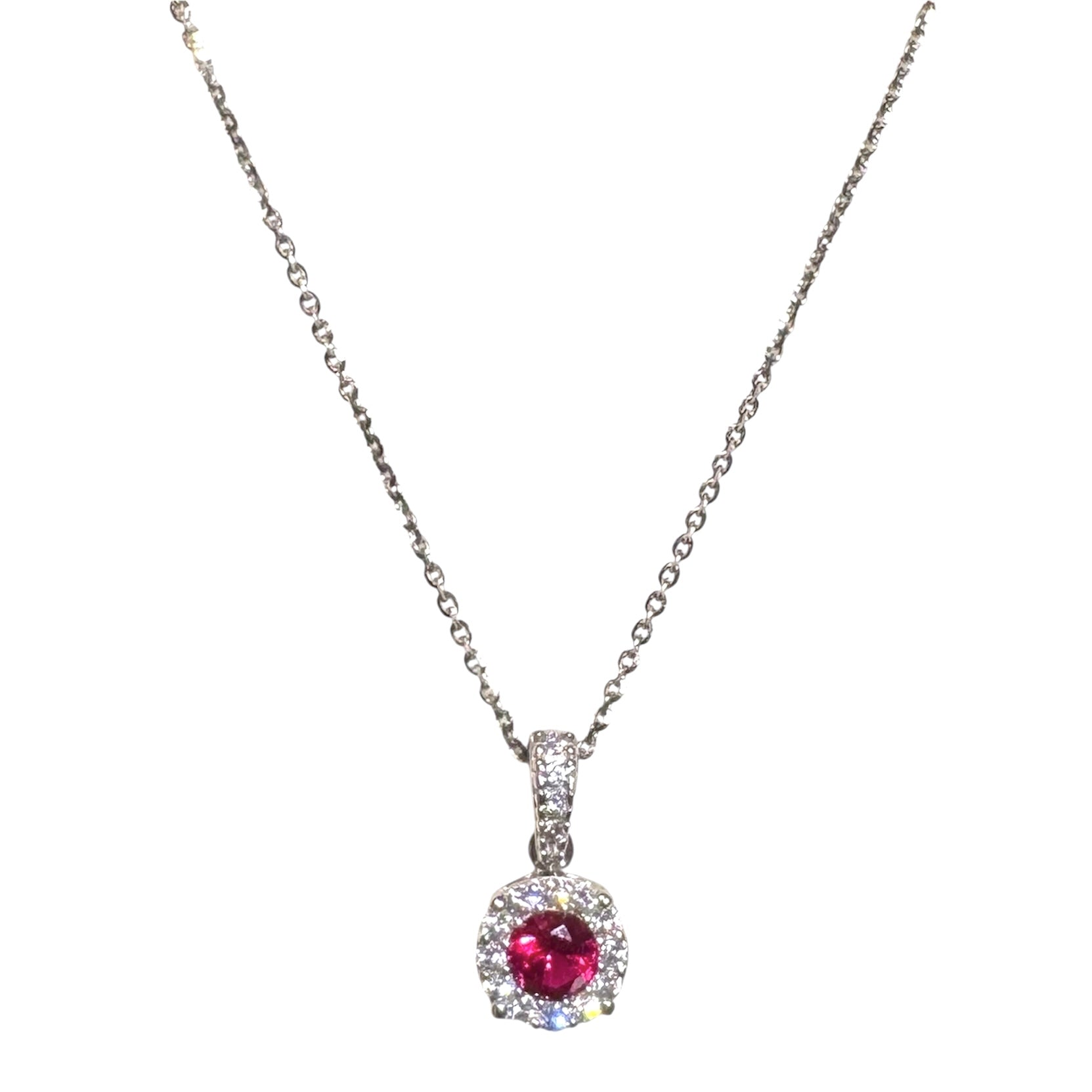 Collana in oro bianco 18KT/750% con ciondolo con zircone rosso grande incastonato nel centro, contornato da zirconi più piccolini.