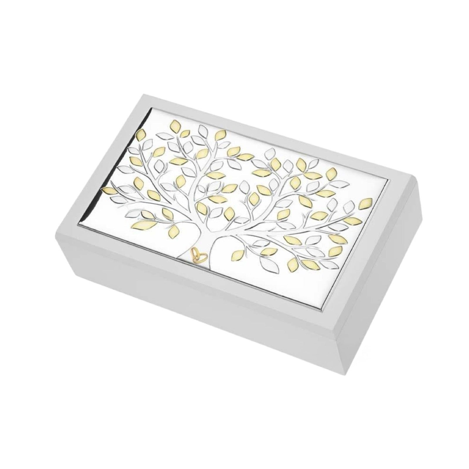 Portagioie in argento con lastra lavorata con fedi e albero della vita con foglie dorate  su base in legno bianca con interno rivestito di vellutino bianco.