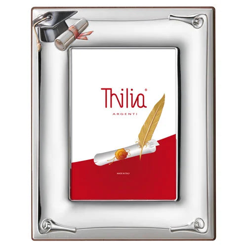 Cornice in argento laminato su base di legno marrone con pergamena e cappello smaltati.