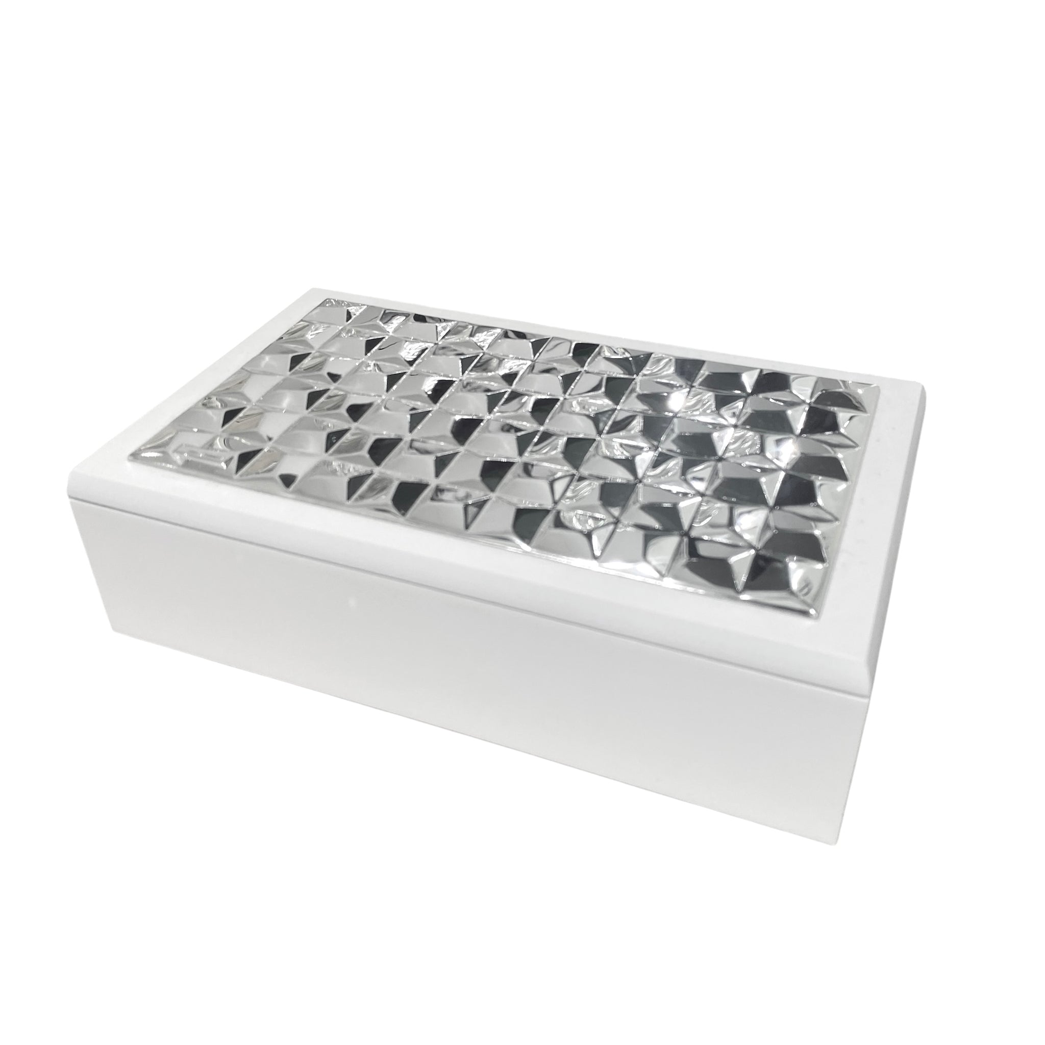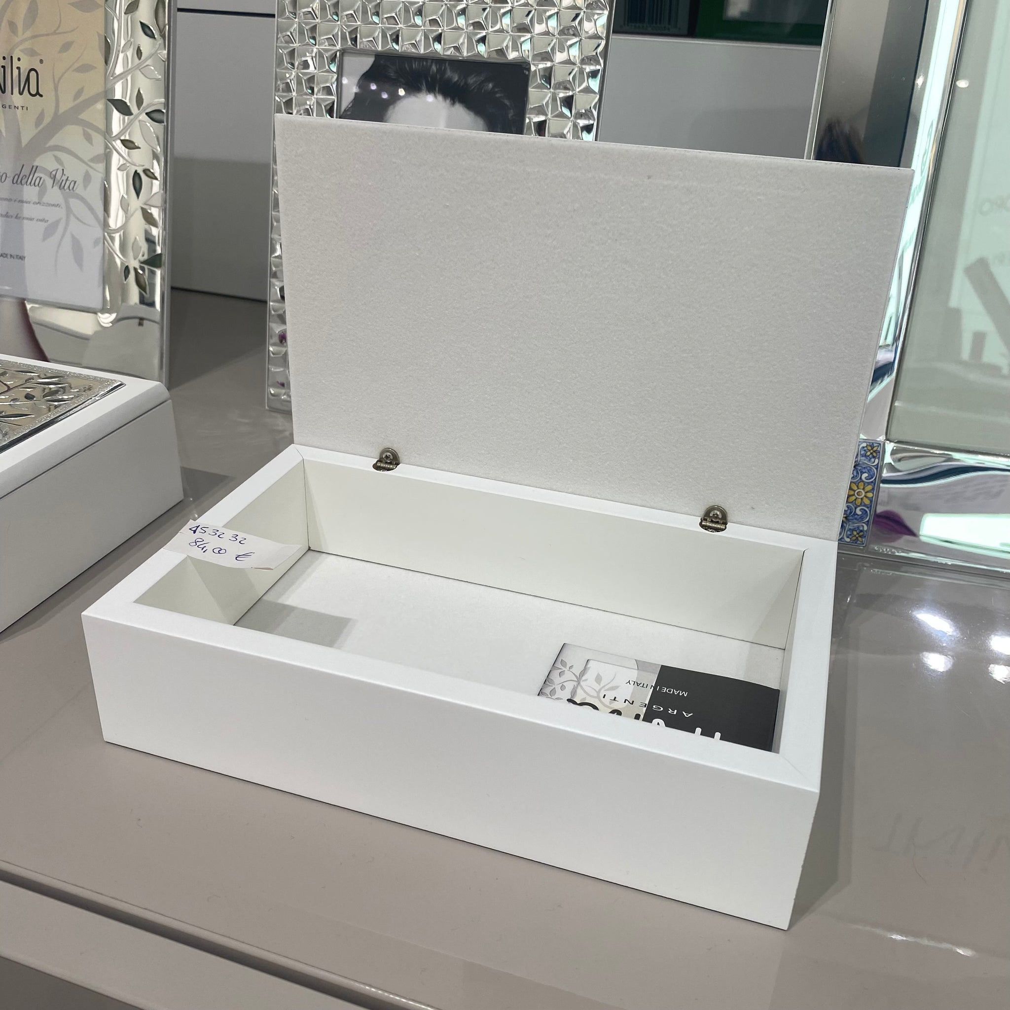 Portagioie in argento con lastra lavorata su base in legno bianca con interno rivestito di vellutino bianco.Dimensioni: cm 20.50 x cm 12.50.