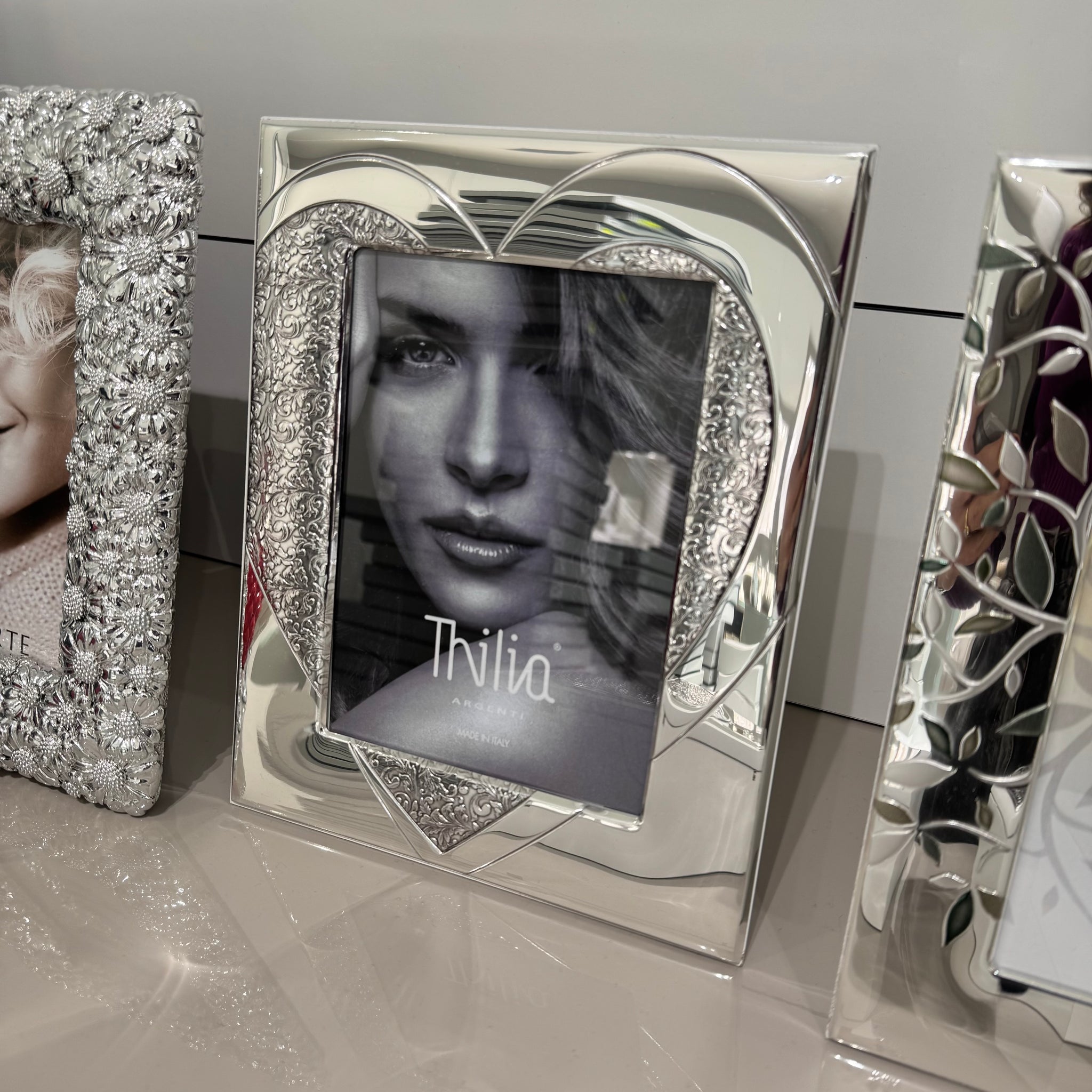 Cornice in argento lavorata con cuore su base di legno bianco.Dimensioni interne 13x18dimensioni esterne 20x25.5