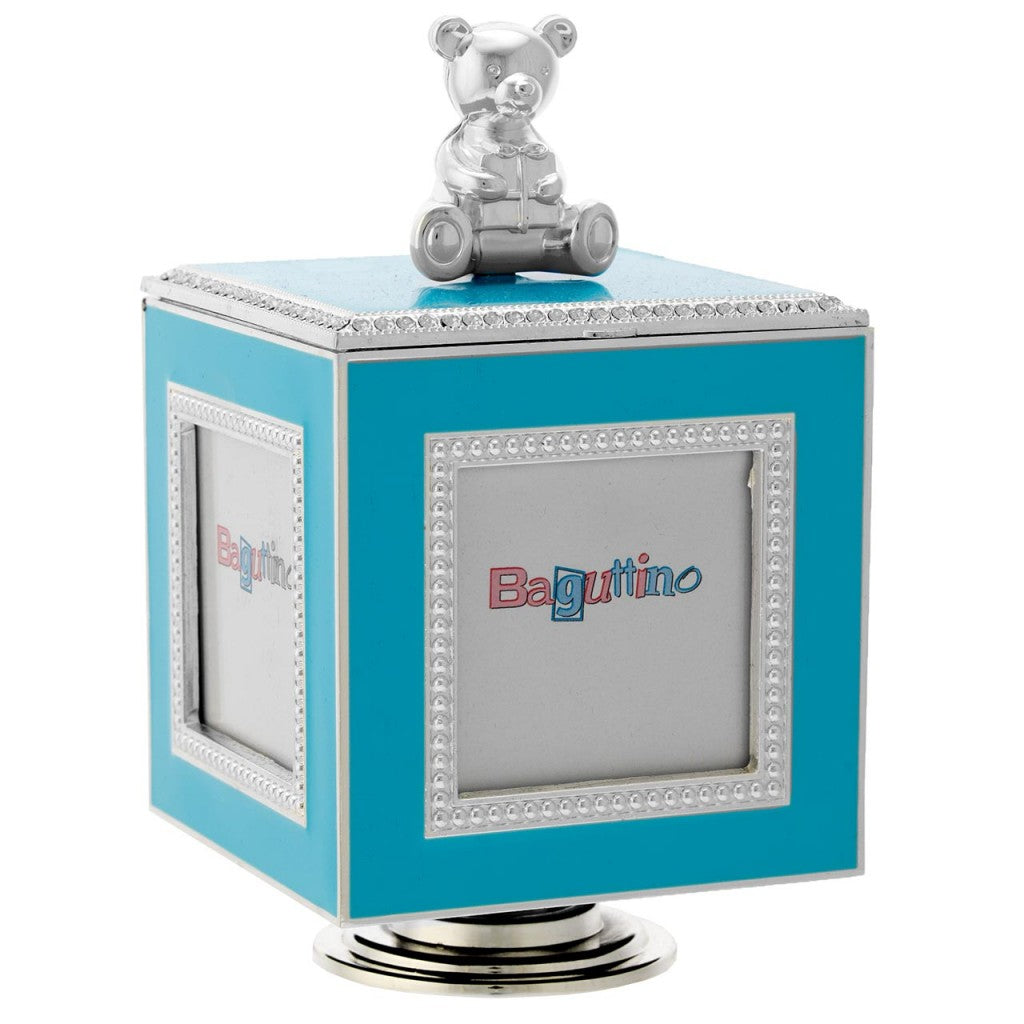 Scatola porta oggetti rivestita di velluto morbido interno con porta foto e orsetto argenteto con lastra smaltata azzurra. Dimensioni 10x10x15