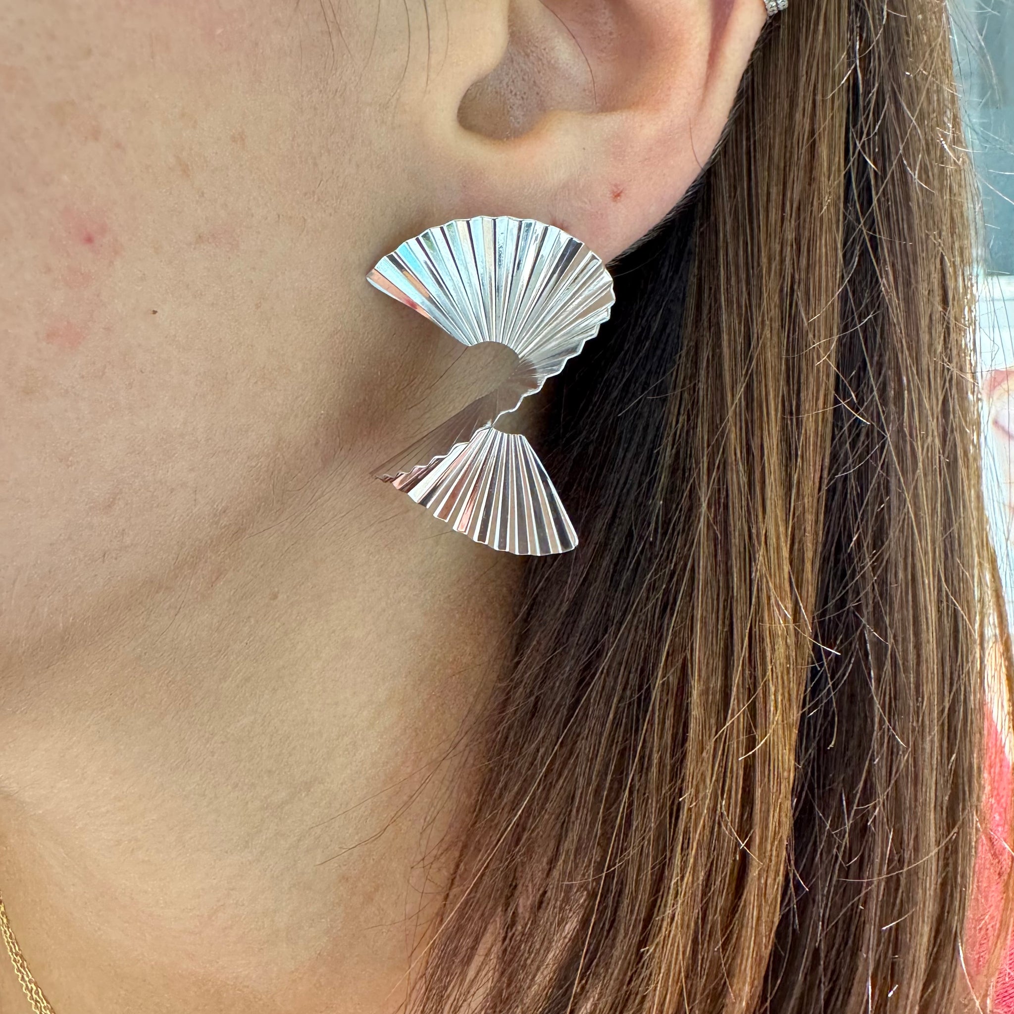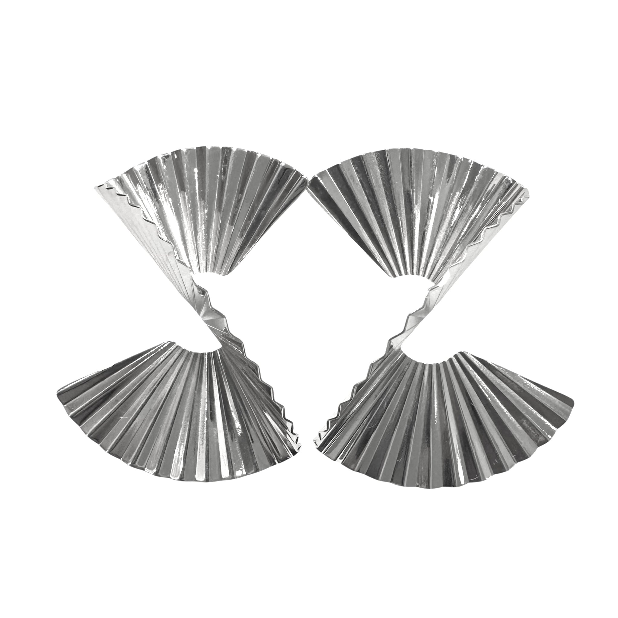 Orecchini in argento 925% a pieghe e che formano una spirale. Chiusura paletto e farfallina