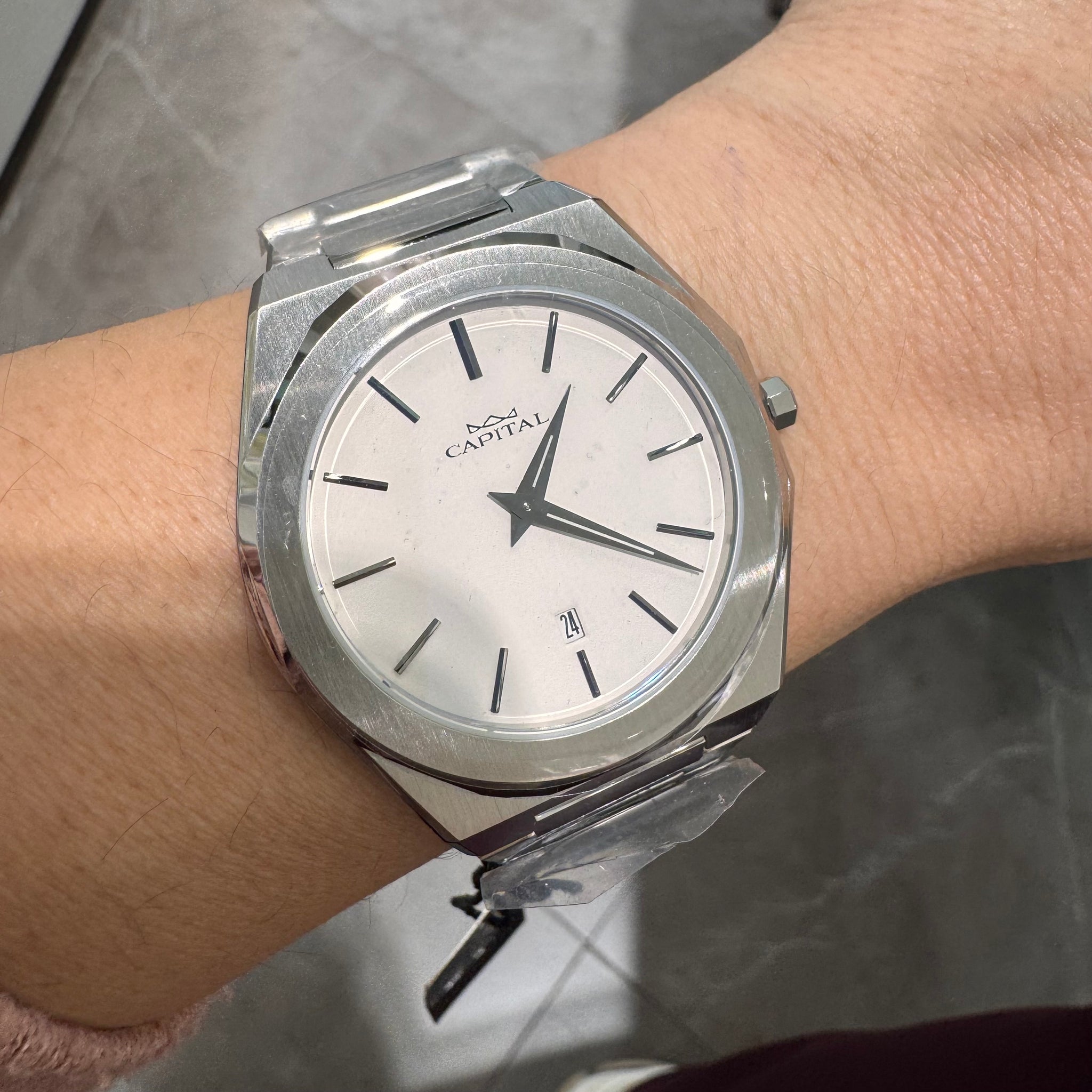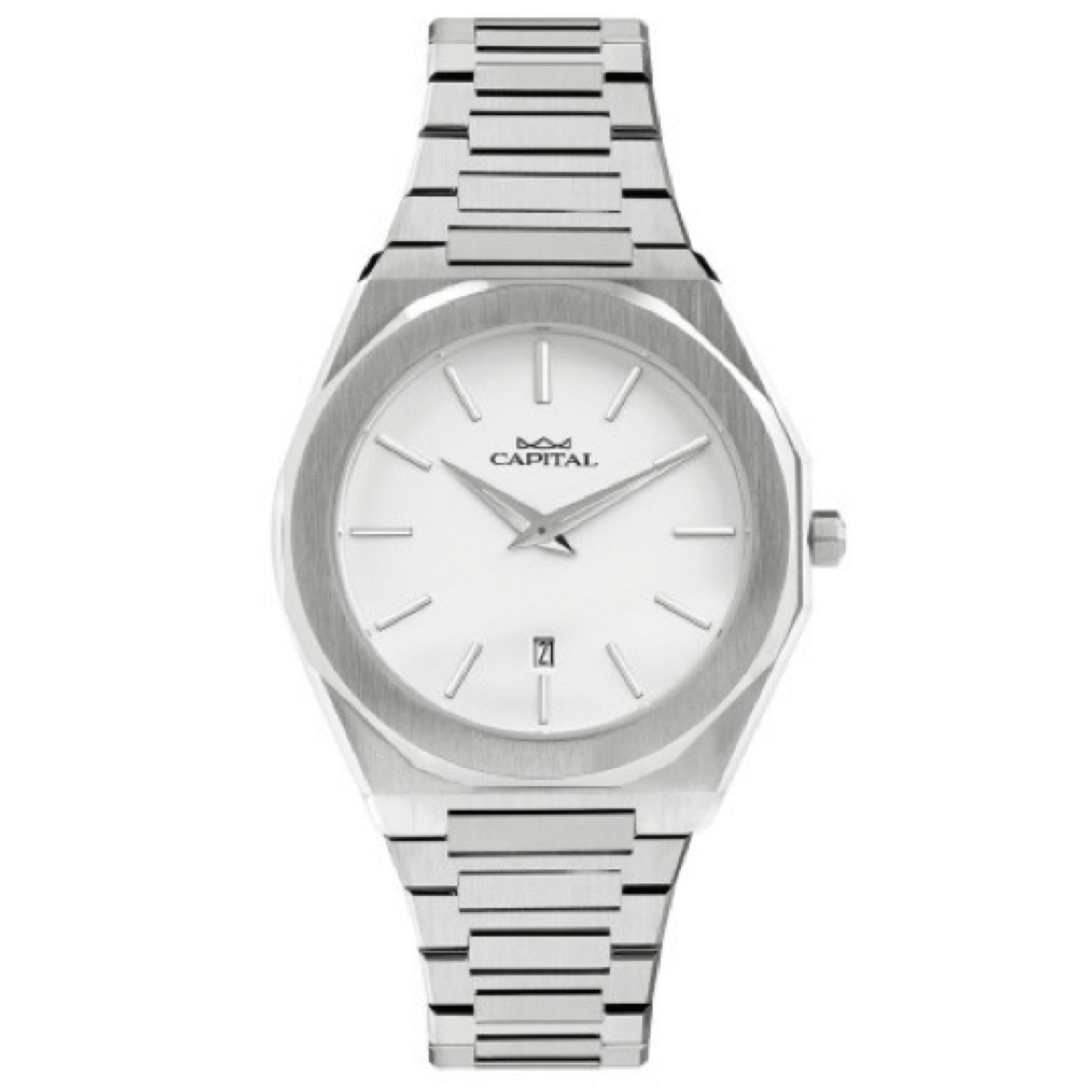 Orologio solo tempo da uomo di Capital della collezione toujours. Orologio con cassa in acciaio di forma ottagonale con ghiera liscia da 41 mm. Orologio con quadrante bianco indici di colore acciaio. Bracciale in acciaio di lunghezza standard e misura regolabile. Orologio con resistenza all'acqua di 5 atm,movimento al quarzo con data. La referenza è ax540-03